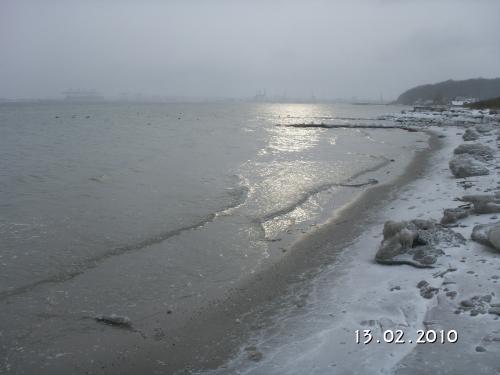 Mein "Hausstrand" und die Århusienser Skyline im winterlichen Dunst eines kalten Februarsamstags.